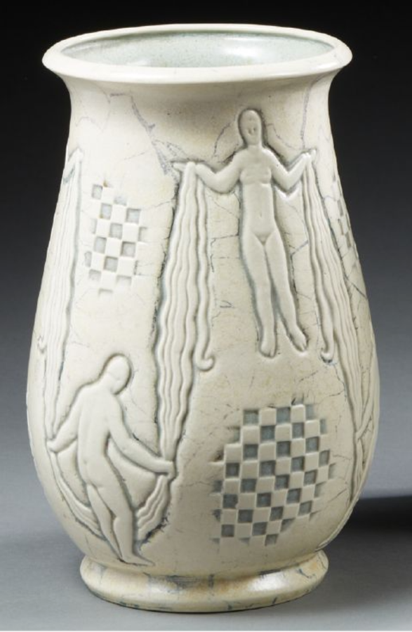Vase en grès émaillé crème à décor gravé de baigneuses et d'ondulations simulant les vagues Signé et numéroté en creux sous la base « Mougin Nancy 269 » et « Legrand.Dc », numéroté 5656 Vers 1920
