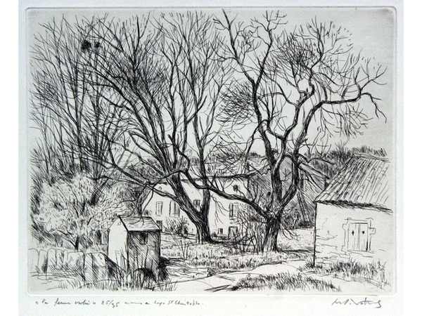 on ajoute trois gravures, dont une vue de Pont-à-Mousson, une autre représentant "La Ferme Sainte-Geneviève au plateau de Malzéville" (justifiée 15/60, cuvette : 23,5 x 29,3 cm.)